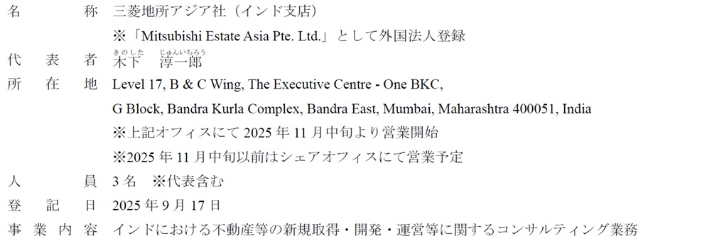 三菱地所は、100%子会社のMITSUBISHI ESTATE ASIA PTE.LTD.(所在地:シンガポール、三菱地所アジア社)のインド支店をムンバイに設立した。2025年9月17日に会社登記を完了した。10月以降に営業を開始する予定。