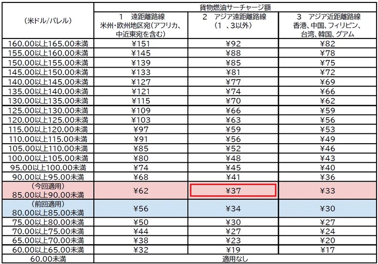 日本航空(JAL)は2025年10月20日、11月1日(土)から適用する日本発国際貨物燃油サーチャージを発表した。シンガポールを含むアジア遠距離路線は1Kgあたり37円で、10月より3円上がる。