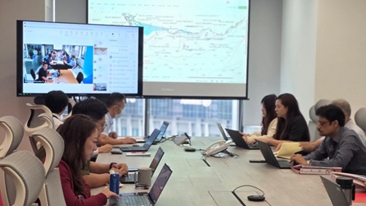 同演習では、“EUROPA BAY”がインドネシアのカリオランへの航行中に機関室で火災発生、乗組員による消火活動にもかかわらず火災は拡大しエンジン停止、CO2消火装置作動により鎮火、機関損傷で漂流という想定のもと、KLPLに事故対策本部を設置し、KRBSと対応を協議、社内外関係者との連携や情報共有の体制等の緊急対応体制の確認を行った。
