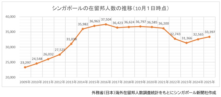 在シンガポール邦人数は、前年同日比832人(2.6%)増の3万3,397人で2年連続で増加した。内訳は、長期滞在者が同比3.0%増の2万8,549人、永住者は同比0.1%減の4,848人だった。