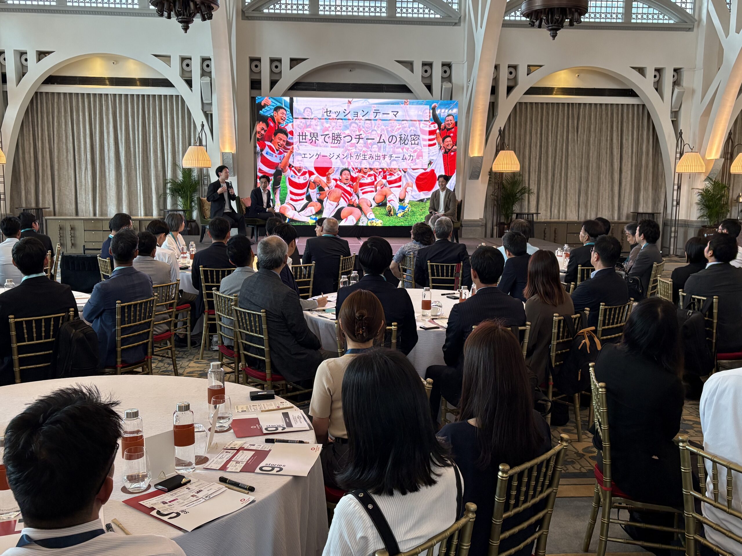 パーティ第1部では、元ラグビー日本代表キャプテンの廣瀬俊朗氏(HiRAKU代表取締役)を迎え、「世界で勝つチームの秘密 エンゲージメントが生み出すチーム力」をテーマとするセッションが行われた。この中で、廣瀬氏は、ラグビー日本代表の過去の戦績とキャプテンに就いた頃のチームの雰囲気について「一番衝撃を受けたのは1995年ワールドカップでニュージーランド代表Bチームに17対145で負けた試合。日本代表は1991年にジンバブエに勝利した以外は負け続けており、注目されない状況が続いていた。その中で、自分はチームに合流した。チームの空気には『相手は強いし、早いし、歴史あるし、だから勝てなくても仕方がない』という言い訳があったり、日本のファンも『負けたけど今日は良い試合だった』と優しかった。課題感があった」と振り返ったうえで、ワールドカップ2015で世界ランキング3位(当時)の南アフリカ代表に勝利したことなどにも触れながら、キャプテンの役割について「キャプテンには人事権がない。選ばれた選手でいかにまとまっていくかが大事になる。なにより一番大切なのは人間関係」と強調した。